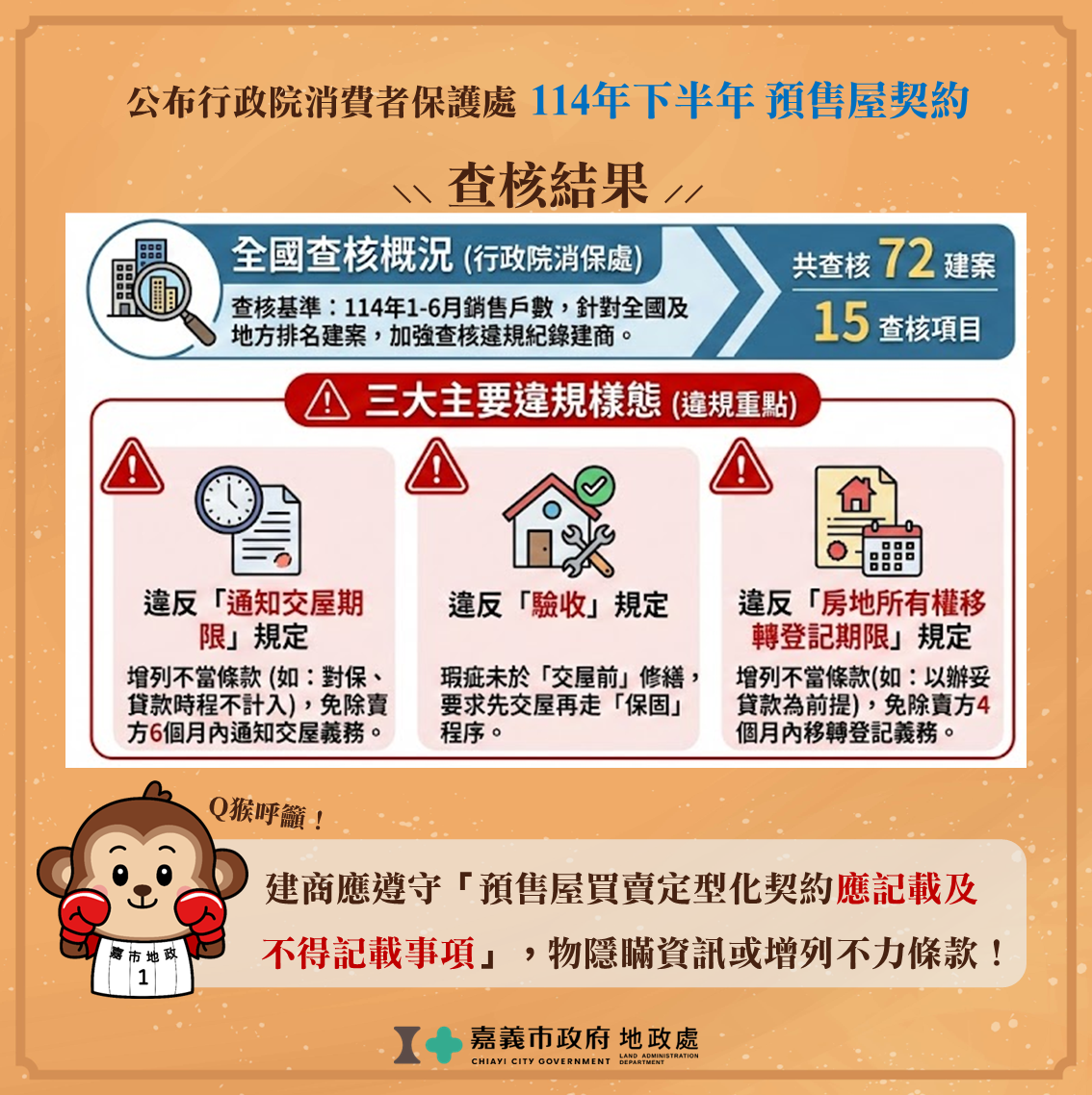 行政院消費者保護處以114年1月至6月之銷售戶數為基準,就「全國銷售排名前10名」及「地方銷售排名(直轄市:銷售排名前4名;縣/市:銷售排名前2名)」之建案進行查核;並針對同一建商過去查核有2次以上違規紀錄者,加強查核。